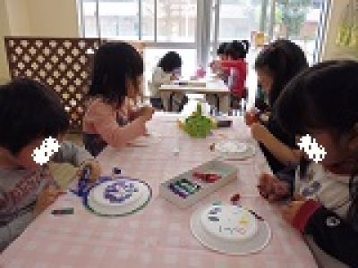 今年度、最後の造形あそびがありました。今回は子どもからのリクエストにより、時計作り。紙皿を文字盤にし、マジックやシールを使って個性豊かな時計が出来上がりました。